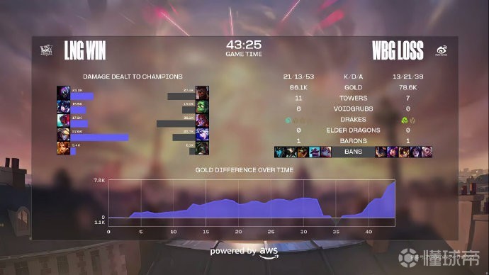 第43分钟,远古龙团,LNG打出1换5团灭WBG扳平比分,21-13。
