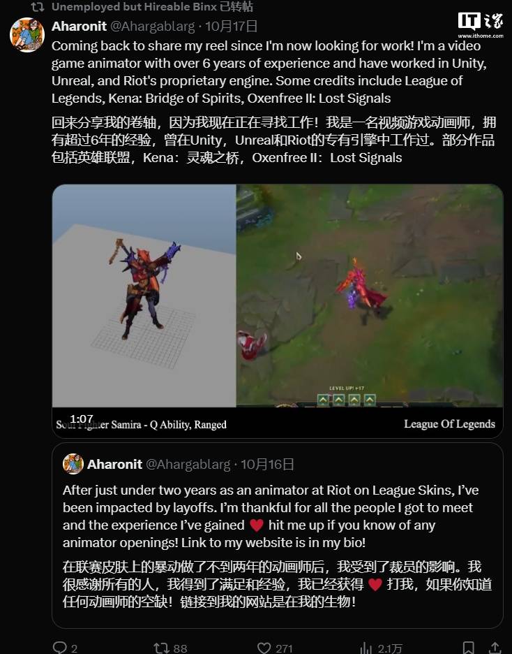 IT之家注意到,Ben Rosado 也转发了多位游戏设计师的帖子,帮助前同事们找新工作 —— 他们同样都在拳头游戏的裁员名单中。